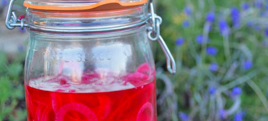 Slice the red onion thinly; the thinner the onion, the quicker the pickle! Place onion into a ceramic or glass bowl or jar. Do not use metal.